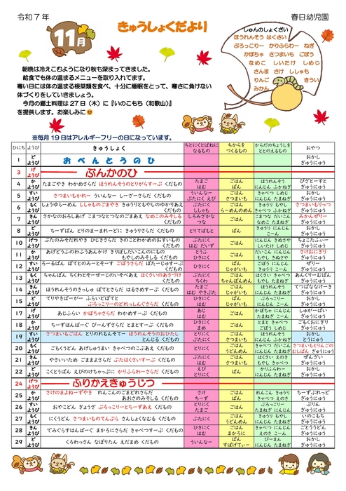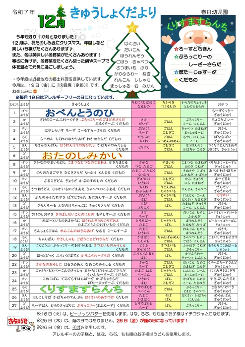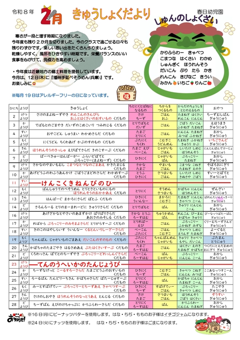 ・アレルギーを持つ子については家庭連絡ノートなどを通して連携を密にし、除去食・代用食を調理する。