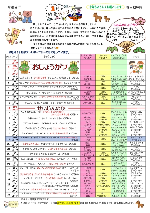 令和8年1月給食だより あけましておめでとうございます。新しい一年が始まりました。 好きな食べ物、嫌いな食べ物それぞれあると思いますが、いろいろな食物に出会うことも食育の一つです。今年も「給食」で子どもたちがいろいろ な味に出会い、お友達と楽しみながら食事ができるように、工夫を凝らした食事を提供していきます。 【1月旬の食材】 はくさい だいこん ほうれんそう ごぼう きゃべつ ぶろっこりー ぶり かりふらわー ねぎ れんこん こまつな みかん令和8年1月給食だより